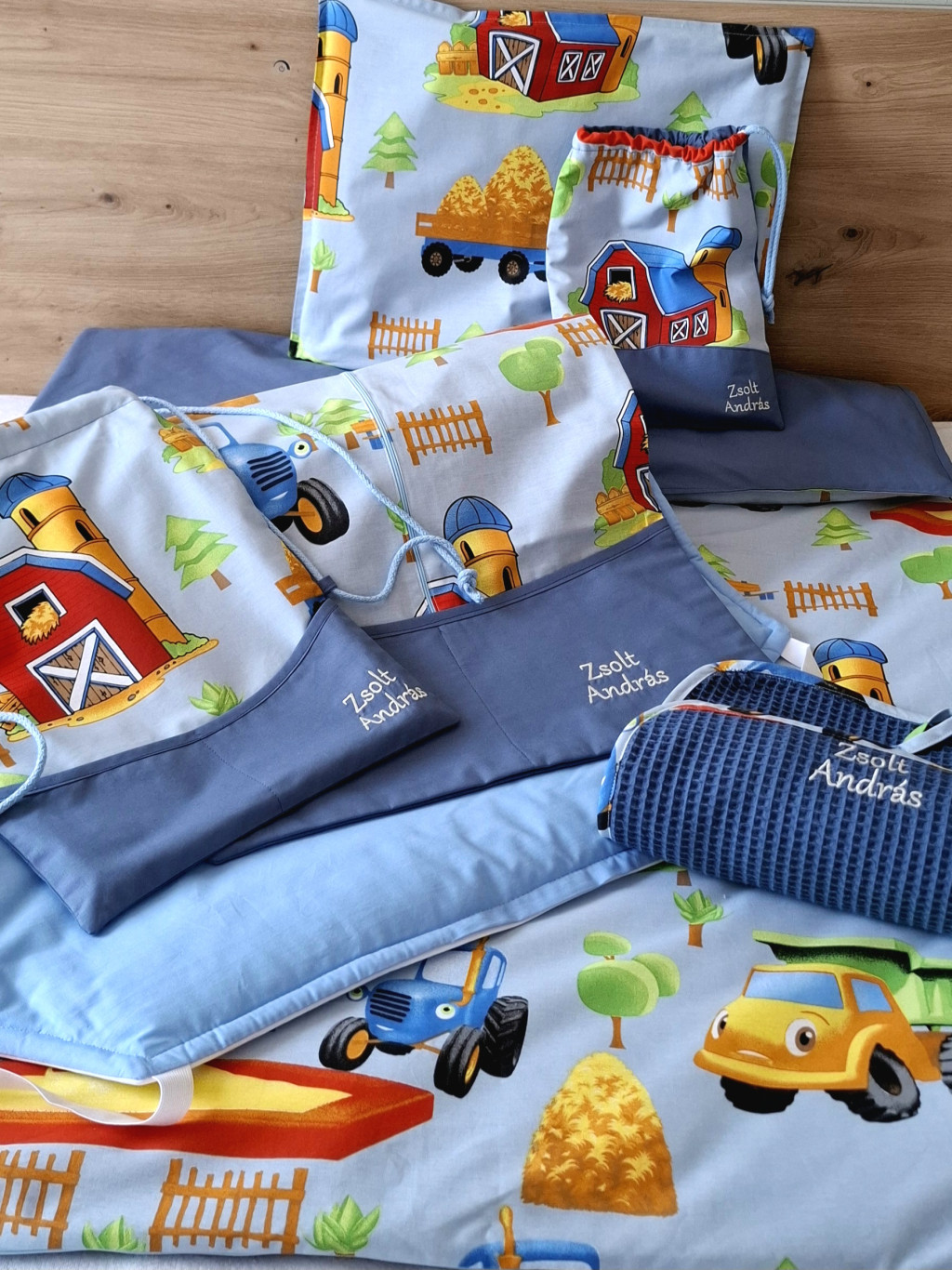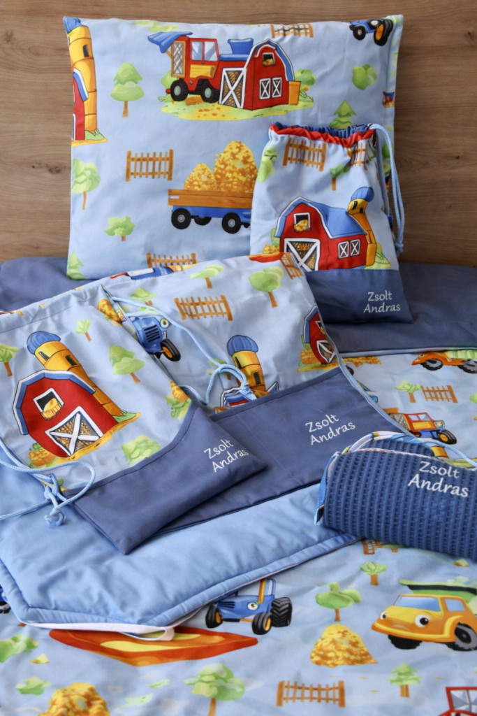 ÚJ Minőségi pamutvászon ovis kezdő szett – 6 részes-farm kék-szilvakék mintával.