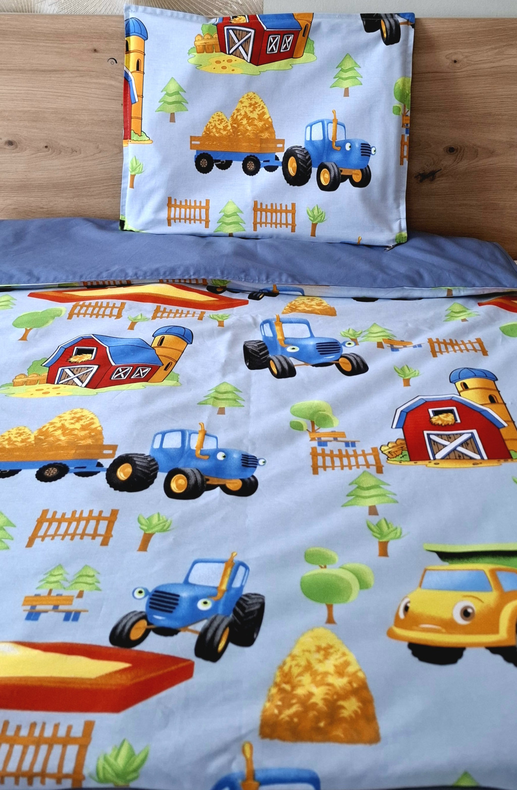 A másik oldal egyszínű pamutvászon, amely szépen kiegészíti a mintás oldalt, és harmonikus, letisztult megjelenést ad a szettnek.