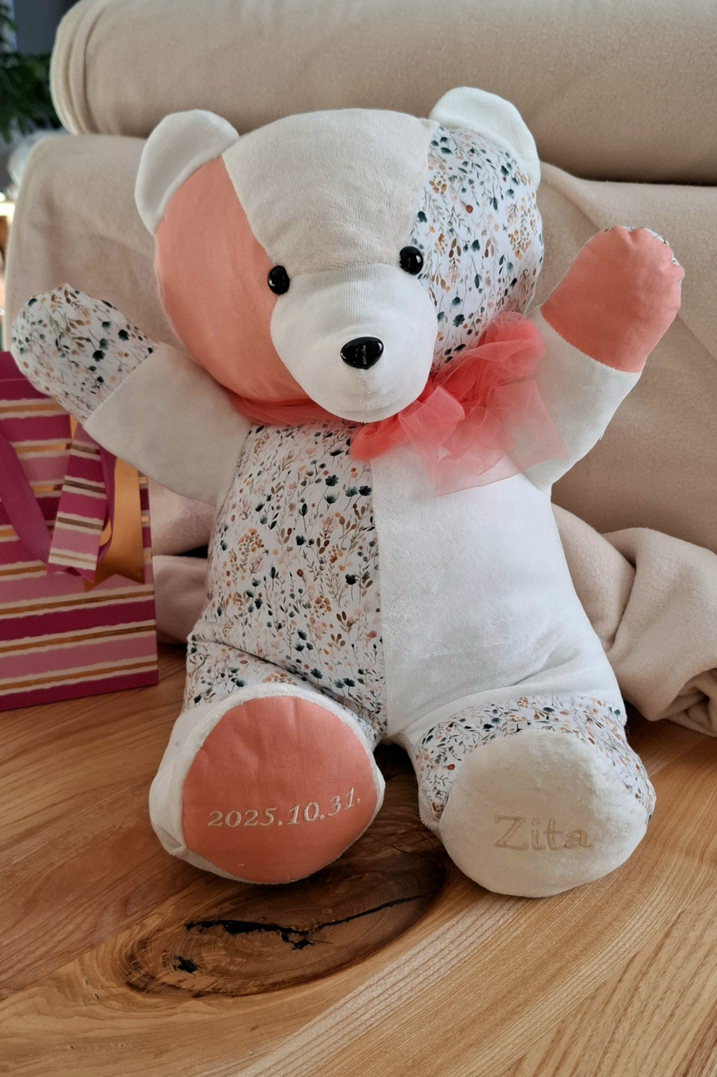 Még egyedibbé tehető, ha a maci egy részére – például a sáljára vagy egy kis alkatrészére – emlék-anyagot használunk. Lehet ez az első tipegőből egy darabka, egy régi takaró sarka, vagy egy olyan anyag, ami a családnak fontos emléket őriz. Így minden ölelésben ott rejtőzik egy történet, egy érzés, egy felejthetetlen pillanat.
