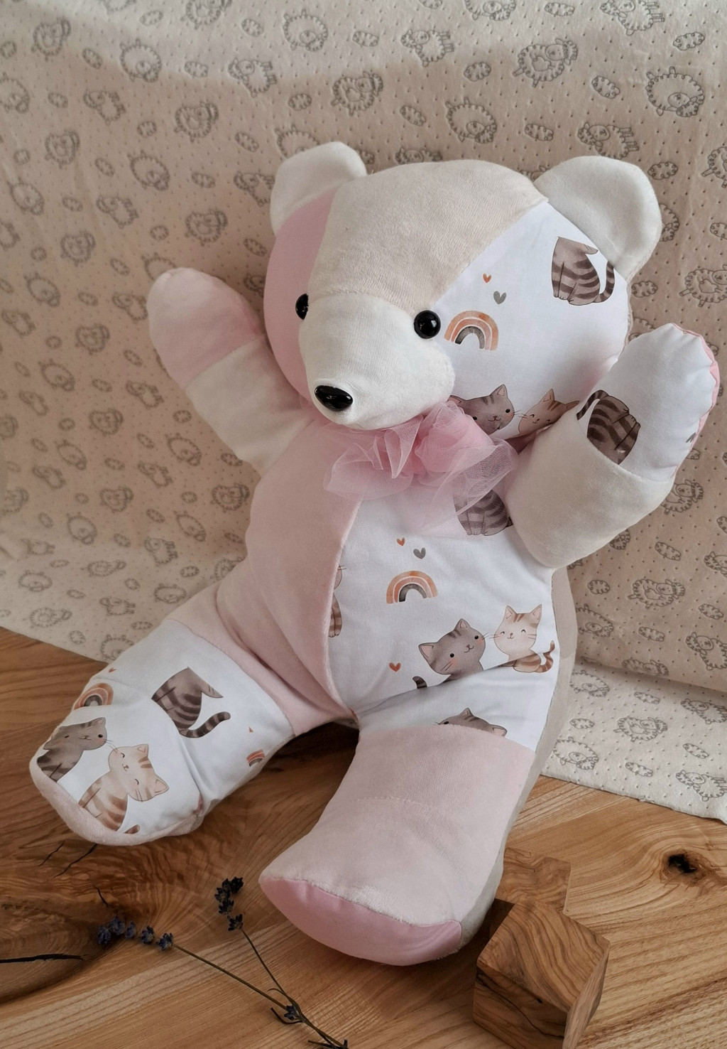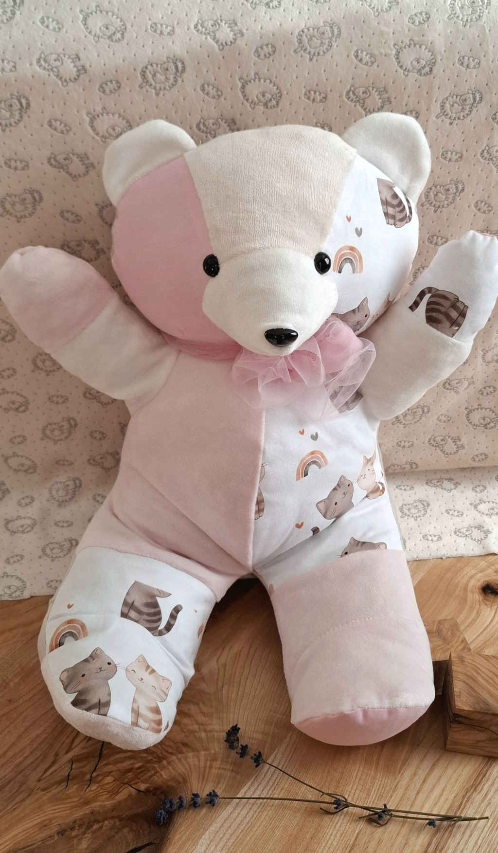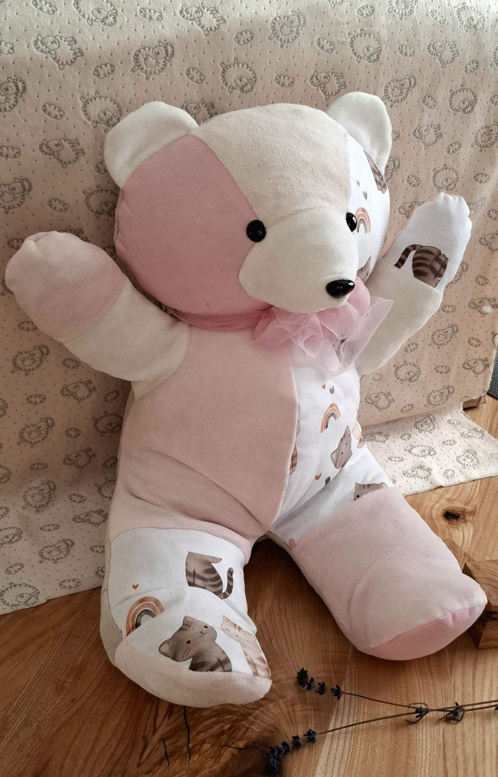 Még egyedibbé tehető, ha a maci egy részére – például a sáljára vagy egy kis alkatrészére – emlék-anyagot használunk. Lehet ez az első tipegőből egy darabka, egy régi takaró sarka, vagy egy olyan anyag, ami a családnak fontos emléket őriz. Így minden ölelésben ott rejtőzik egy történet, egy érzés, egy felejthetetlen pillanat.