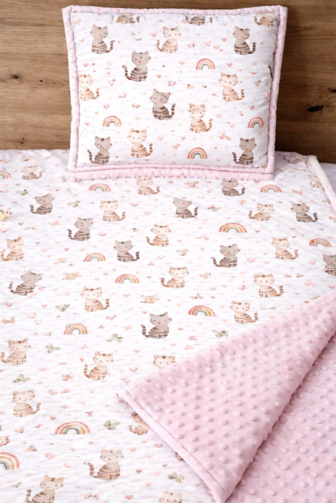 ÚJ Cicák rózsaszín-minky, pamutvászon takaró párna szett