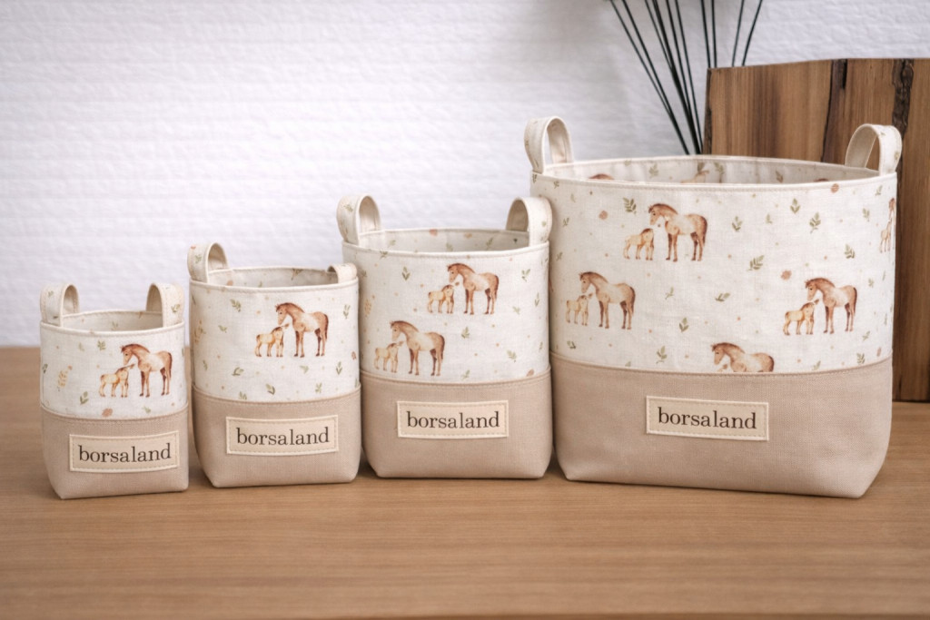 A tároló minőségi pamut anyagból, kézzel készül, megerősített kialakítással, hogy akkor is stabil maradjon, amikor tele van pakolva. A rajta megjelenő minták egyedi textiltervezői munkák, amelyek végigvonulnak a Borsaland termékein, így könnyen összehangolhatók más darabokkal is.