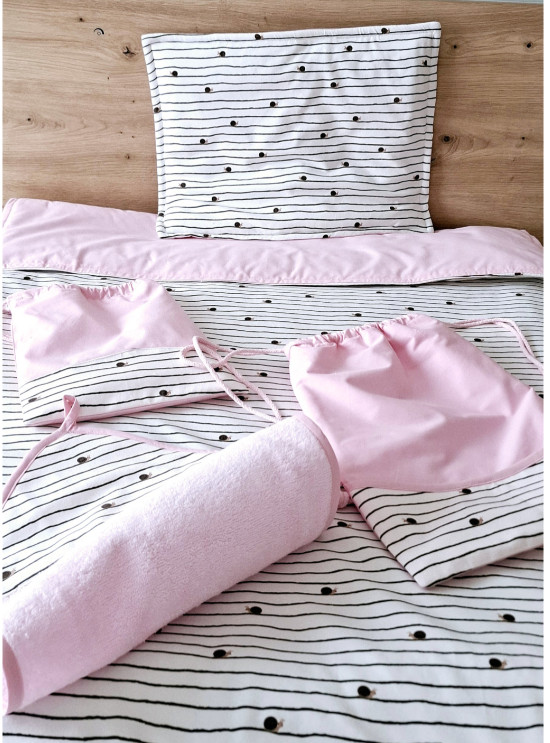 A másik oldal egyszínű pamutvászon, amely szépen kiegészíti a mintás oldalt, és harmonikus, letisztult megjelenést ad a szettnek.