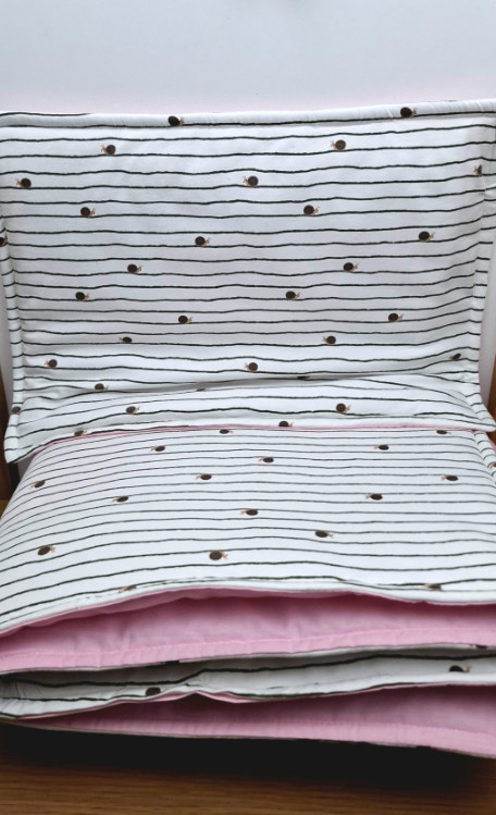 A takaró és a párna 150 g vatelinnel összevarrva készül, így a huzat és a bélés egy egységet alkot.