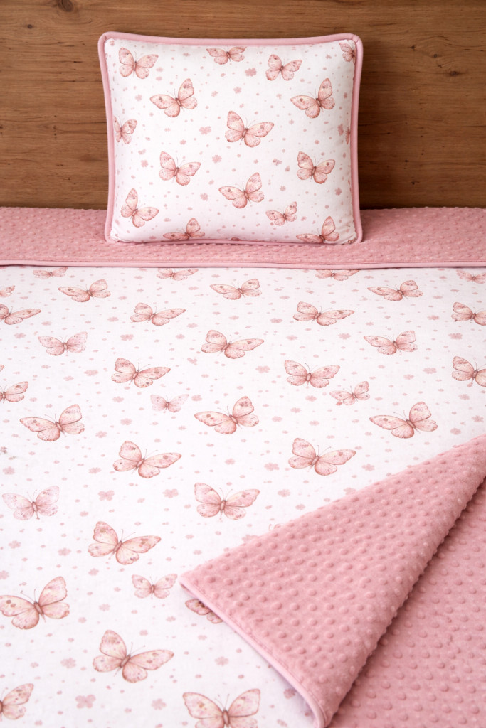 Pillangók mályva-minky, pamutvászon takaró párna szett