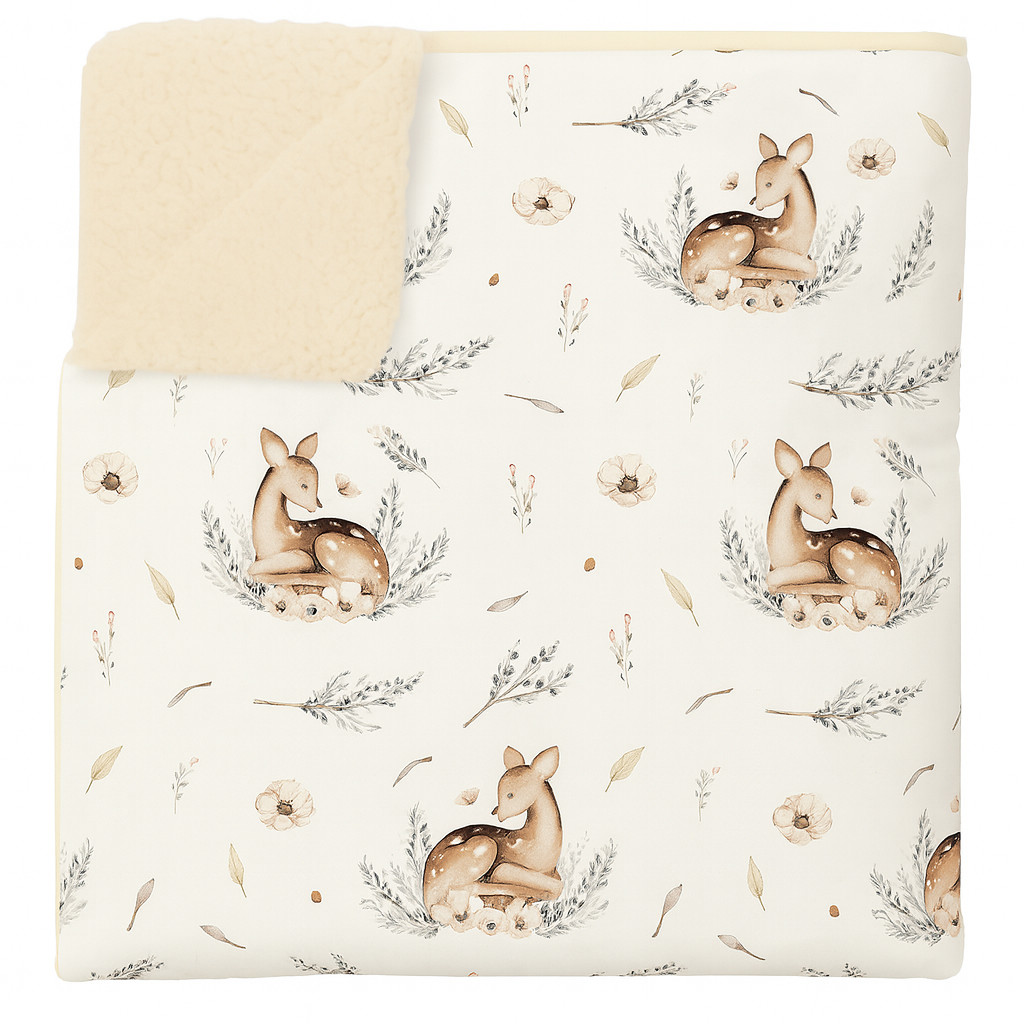 A sherpa oldala finoman körülöleli a kicsit, míg a pamutvászon oldal egyedi, szeretettel tervezett mintáival mesét varázsol a pihenés pillanataiba.